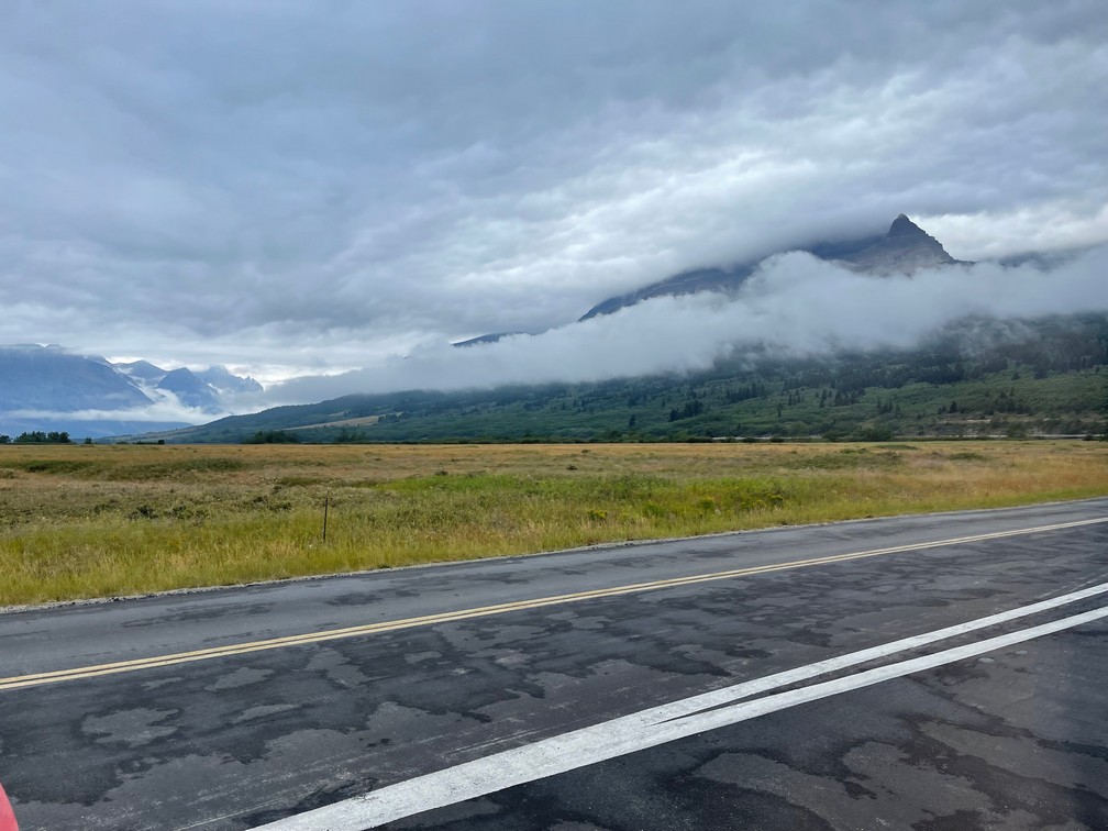 Even with our proactive reservations it was still a bit of a cluster as there are many Red Bus Tour coaches and each are assigned to different tours. By the time we got that sorted out, others had boarded our bus and we were stuck with a seat that had little leg room. Waa, waa, I know, but it was frustrating and uncomfortable for someone with longer legs. So the trip from the lodge to Logan's Pass, our turn-around point, I had my knees in my chest, literally. Compound that with crappy visibility and the first part of the trip was less than desirable. But all is well and we made it to Logan's Pass. A few pictures.